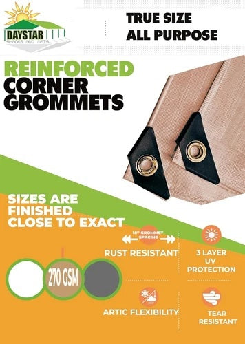 Ultra Heavy-Duty Poly Tarps These Ultra Heavy-Duty Poly Tarps are engineered to provide the ultimate protection against harsh elements and extreme conditions. True finished size within a 1–2-inch margin for error. Our goal is to be as close to True size as possible. Example 10x10 will be as close to 10x10 as possible. Thicker tarps do not stretch as much. 16 Mil polyethylene, this tarp ensures durability and reliability for all your covering needs. The rust-resistant grommets placed approximately every 18 inches and reinforced corners with brass grommets enhance its robustness and ease of use. With a 3-ply material construction, 100% UV protection, and waterproof properties, this tarp is designed to withstand the test of time. It also boasts tear resistance and arctic flexibility, making it ideal for a wide range of applications. Additionally, the rope-reinforced edges add an extra layer of strength, ensuring this tarp remains secure and intact under pressure.