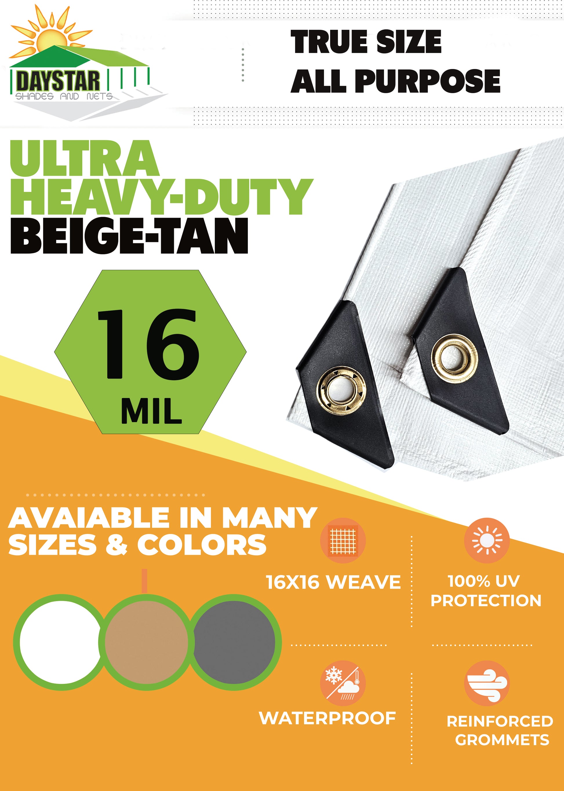 Ultra Heavy-Duty Poly Tarps These Ultra Heavy-Duty Poly Tarps are engineered to provide the ultimate protection against harsh elements and extreme conditions. True finished size within a 1–2-inch margin for error. Our goal is to be as close to True size as possible. Example 10x10 will be as close to 10x10 as possible. Thicker tarps do not stretch as much. 16 Mil polyethylene, this tarp ensures durability and reliability for all your covering needs. The rust-resistant grommets placed approximately every 18 inches and reinforced corners with brass grommets enhance its robustness and ease of use. With a 3-ply material construction, 100% UV protection, and waterproof properties, this tarp is designed to withstand the test of time. It also boasts tear resistance and arctic flexibility, making it ideal for a wide range of applications. Additionally, the rope-reinforced edges add an extra layer of strength, ensuring this tarp remains secure and intact under pressure.